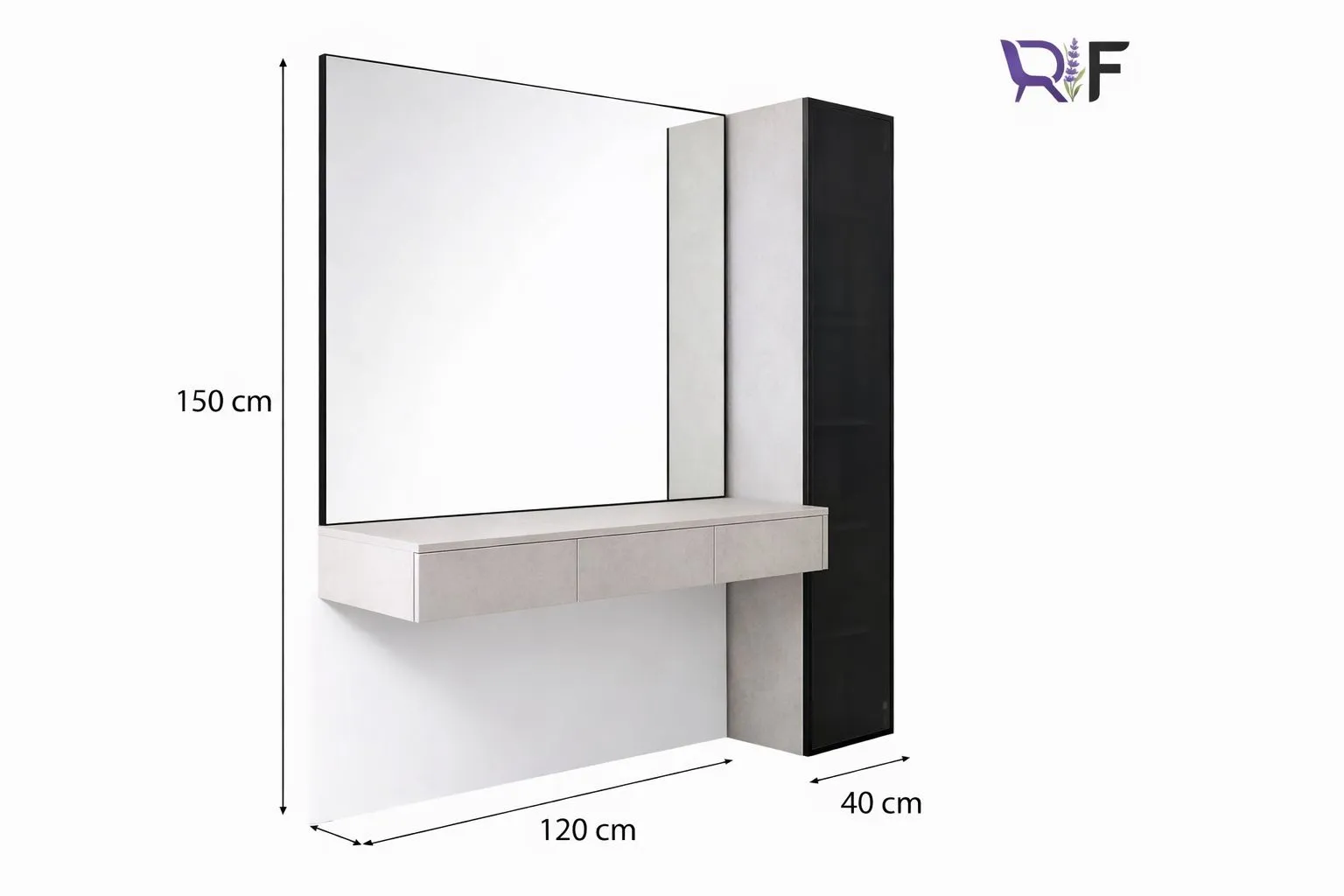 تسريحة عصرية معلّقة بتصميم حديث تضيف لمسة أناقة وفخامة لغرفة النوم، مع استغلال عملي للمساحة. مزوّدة بمرآة أنيقة بإضاءة LED خلفية تمنح إضاءة ناعمة ومثالية للاستخدام اليومي. تحتوي على ثلاثة أدراج عملية للتخزين، بالإضافة إلى مساحة جانبية بباب زجاجي تضيف طابعًا راقيًا ومكانًا منظمًا لحفظ العطور والإكسسوارات.